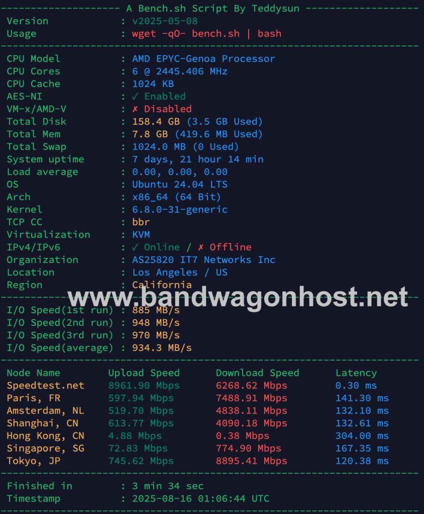 未经允许不得转载:Bandwagonhost中文网 » 2025 搬瓦工美国洛杉矶 (DC9 AMD+NVMe, CT CN2GIA, CMIN2, CUP) [USCA_9] 机房测评