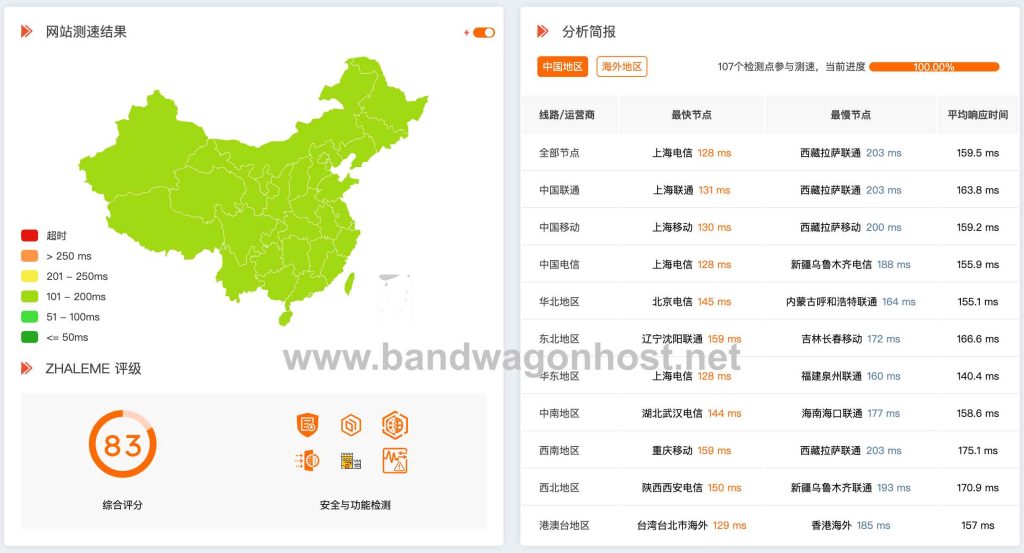 - 线路:延迟、丢包率、回程线路等方面的测试结果都非常好,所以线路方面也可以给几乎满分。