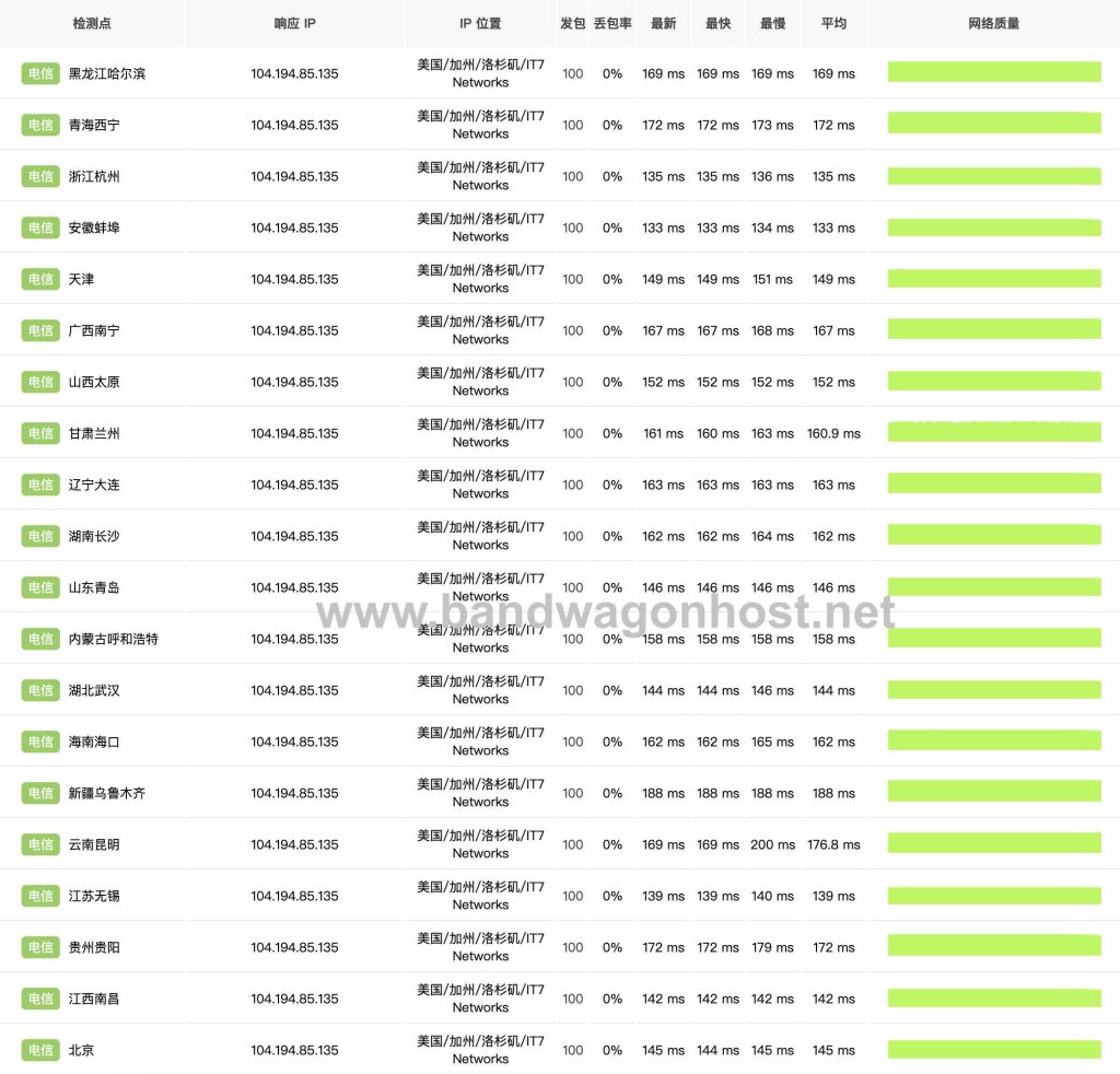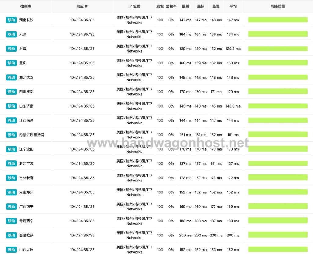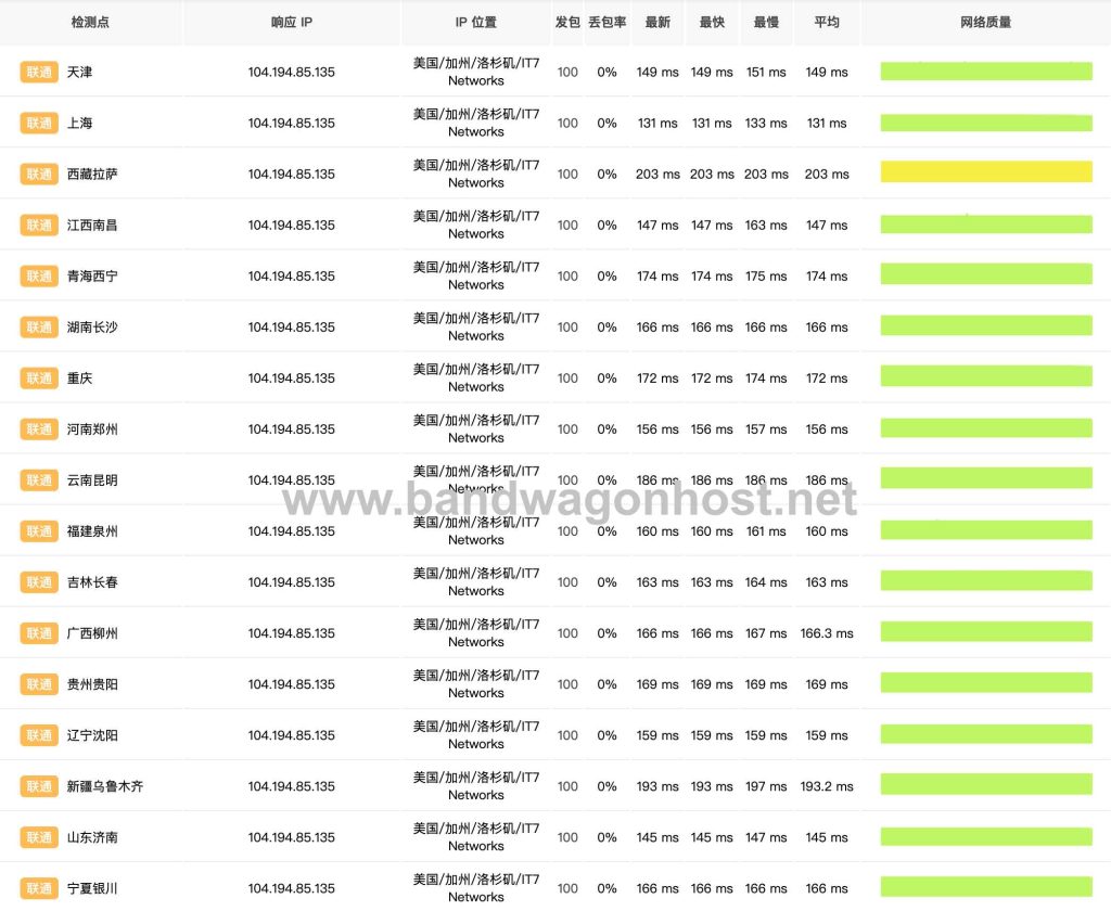 搬瓦工美国洛杉矶 DC9 机房延迟测试结果如下,三网都是绿色的,说明三网延迟都是 200ms 以内,事实上平均延迟都是在 150ms 左右,这个延迟基本上是中美延迟极限了,毕竟物理距离摆在这儿,不可能再低了。