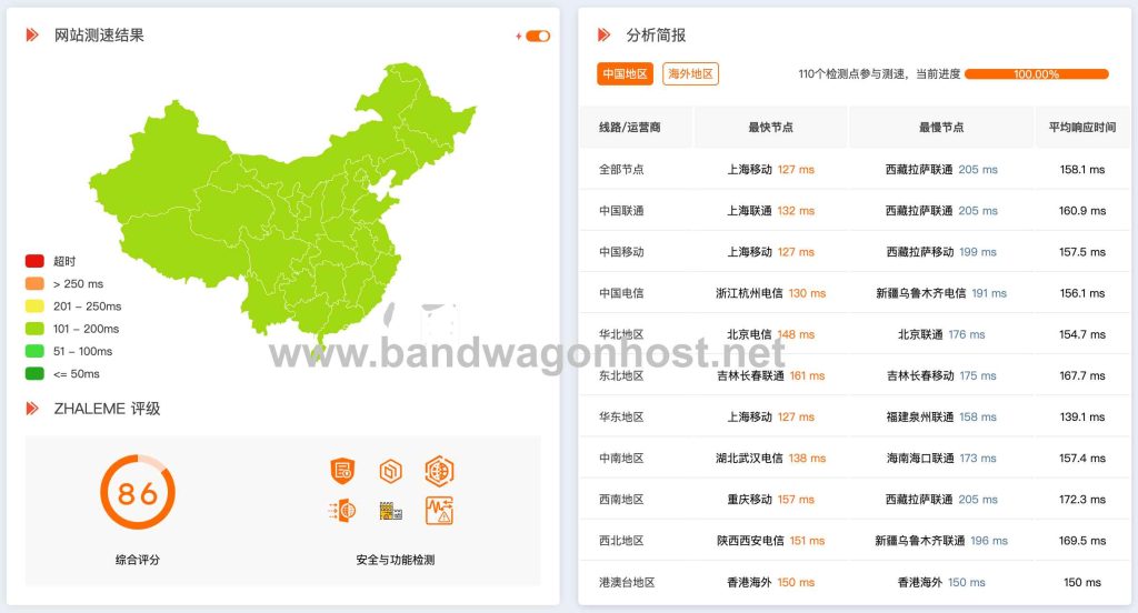 通过对上述数据的分析,我们可以得出关于 DC5 SLA 机房的核心结论:三网延迟表现都很好,并且三网表现比较平衡,华东地区(上海、江苏、浙江等)平均延迟仅为 139.1 ms,最快节点甚至低至 127 ms。一些内陆地区的延迟也被很好的控制在 200ms 左右。这得益于 CN2 GIA 强大的骨干网。