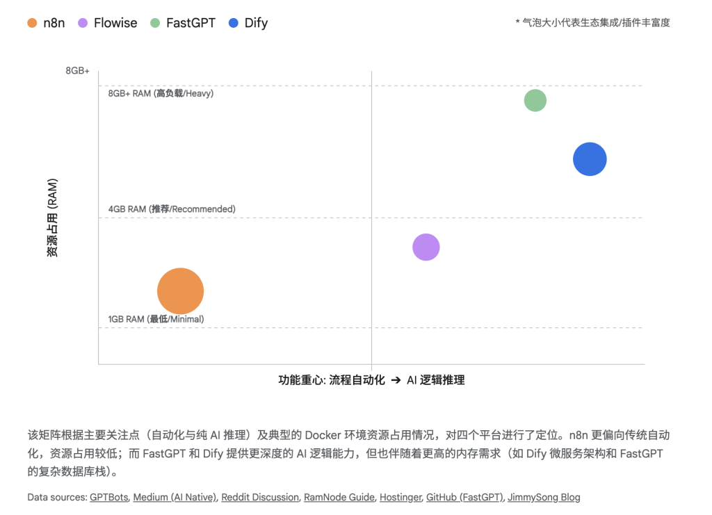 - 架构与资源优势:通常是单体 Node.js 应用,架构简单,资源占用较低(Flowise 甚至支持 SQLite,无需重型数据库)7。但稳定性与易用性不如 Dify 和 n8n,更适合作为”玩具”或”实验台”。