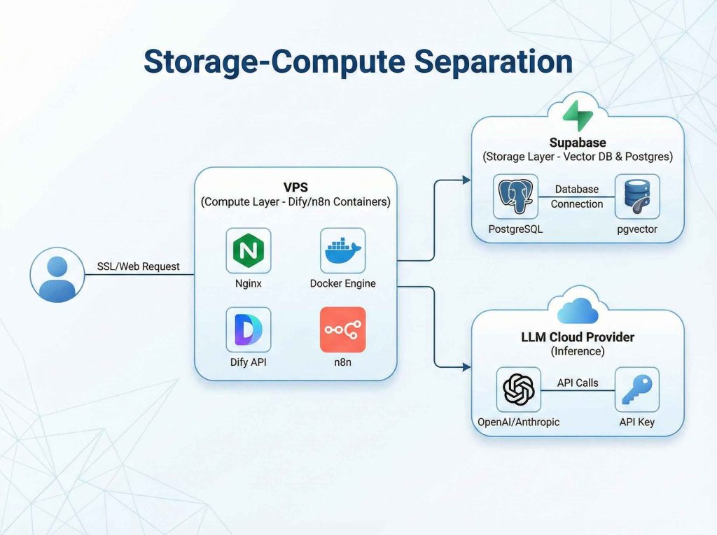 - 关键架构: Docker Compose + 存算分离 (Supabase)