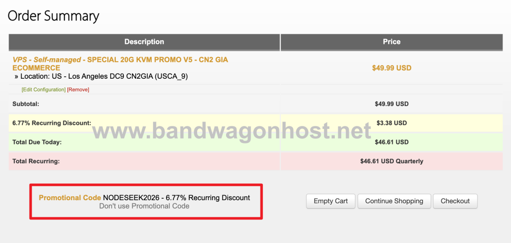 对于正准备入手搬瓦工 VPS 的朋友,站长的建议是:预算有限选 KVM 套餐年付 $49.99 起步,追求速度和线路质量选 CN2 GIA-E 套餐季付 $49.99 起步,不差钱直接上香港 CN2 GIA。购买时记得在 Promotional Code 处填入 NODESEEK2026 获取折扣。