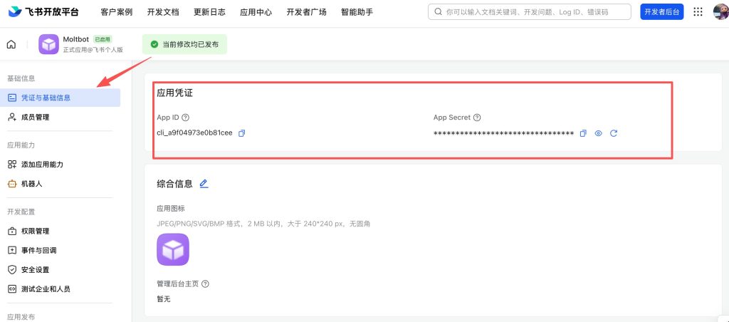 在左侧菜单找到「凭证与基础信息」页面,你会看到两个关键信息: