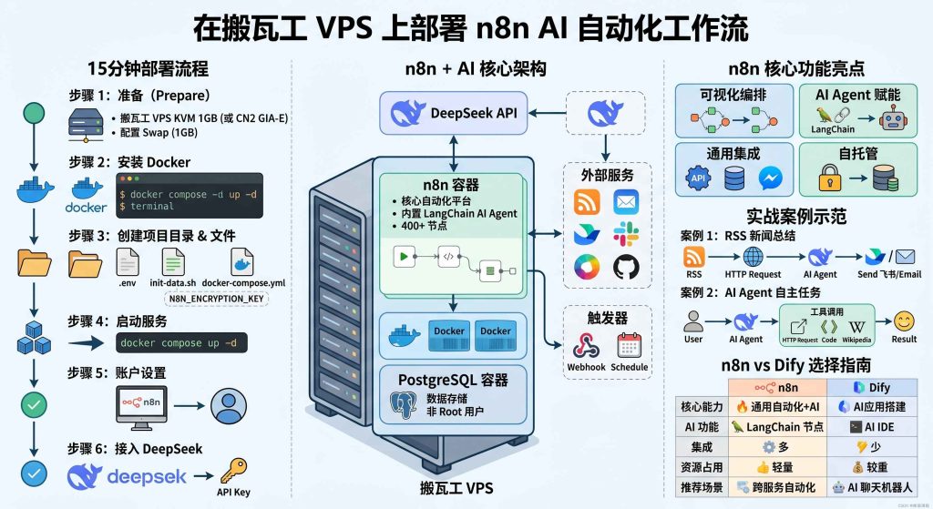 n8n 是目前最火的开源自动化工作流平台之一,可以把各种 API、数据库、AI 模型串成自动化流程,而且内置了 LangChain AI Agent 节点,直接接入 DeepSeek 就能搭 AI 自动化工作流。不需要 GPU,搬瓦工 KVM 1GB 套餐就能跑。本文从零开始,在搬瓦工 VPS 上用 Docker Compose 部署 n8n + PostgreSQL,接入 DeepSeek API,搭建 AI 自动化工作流。整个过程大约 15 分钟。