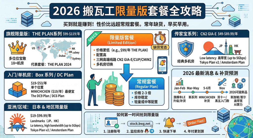 搬瓦工从 2018 年至今推出过 20 多款限量版套餐,覆盖美国、日本、荷兰、香港、迪拜等多个地区。本文按系列全部整理:配置、价格、机房、购买链接、补货规律,以及 2026 年最新补货消息和预测。