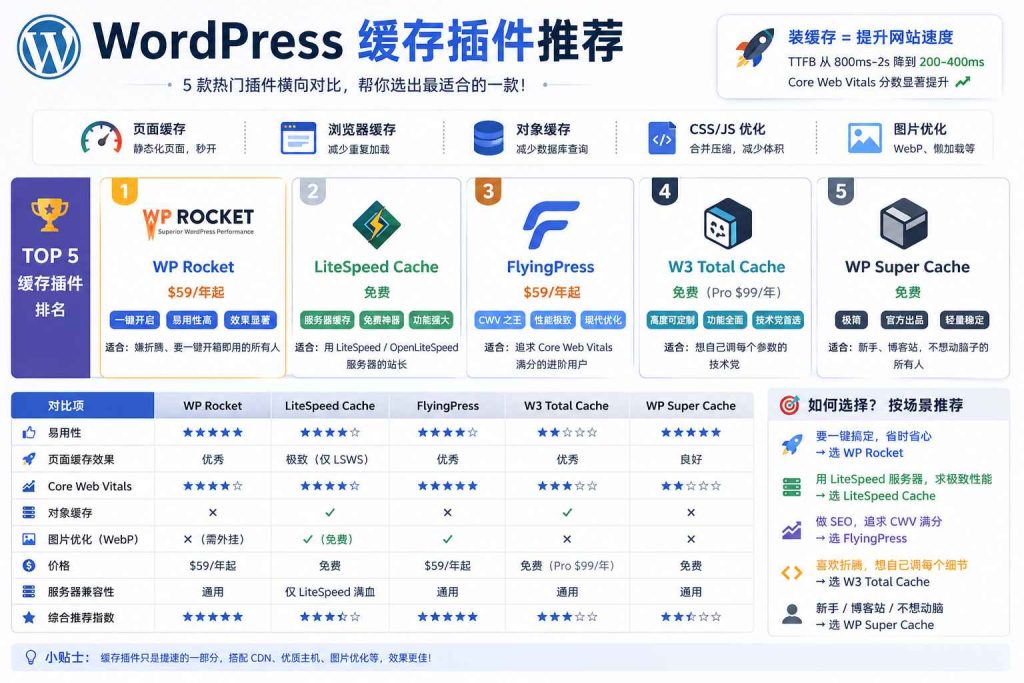 总体来说:WP Rocket 最省心,FlyingPress 追求极致性能。如果你愿意花时间装 OpenLiteSpeed,LiteSpeed Cache 也是顶级选择。免费的话,建议首选 WP Super Cache。
